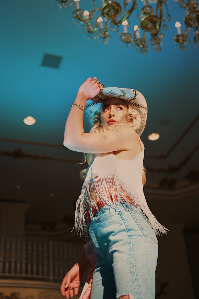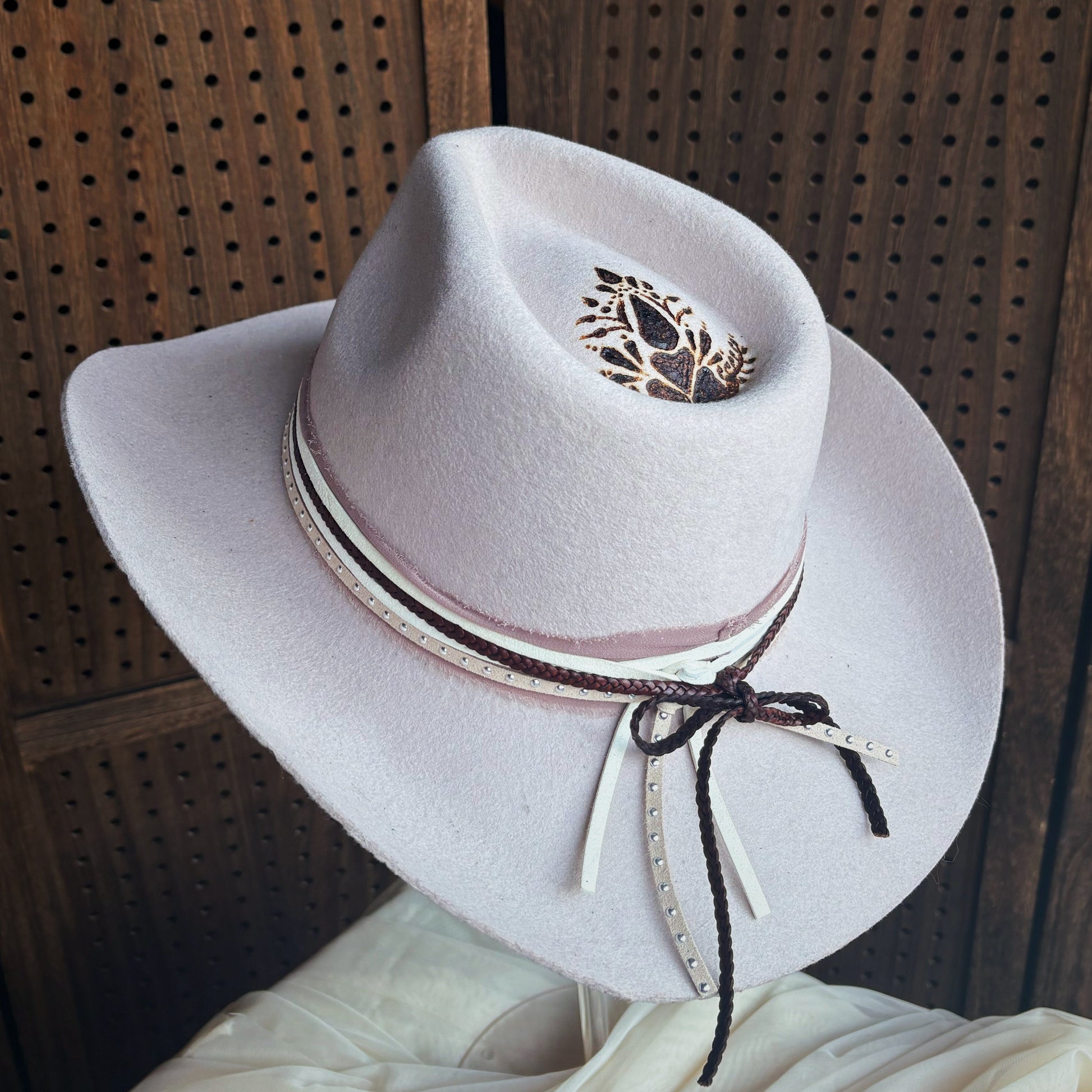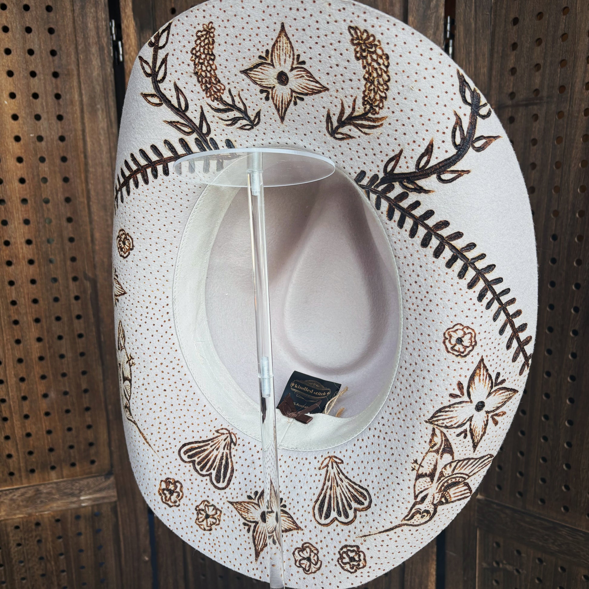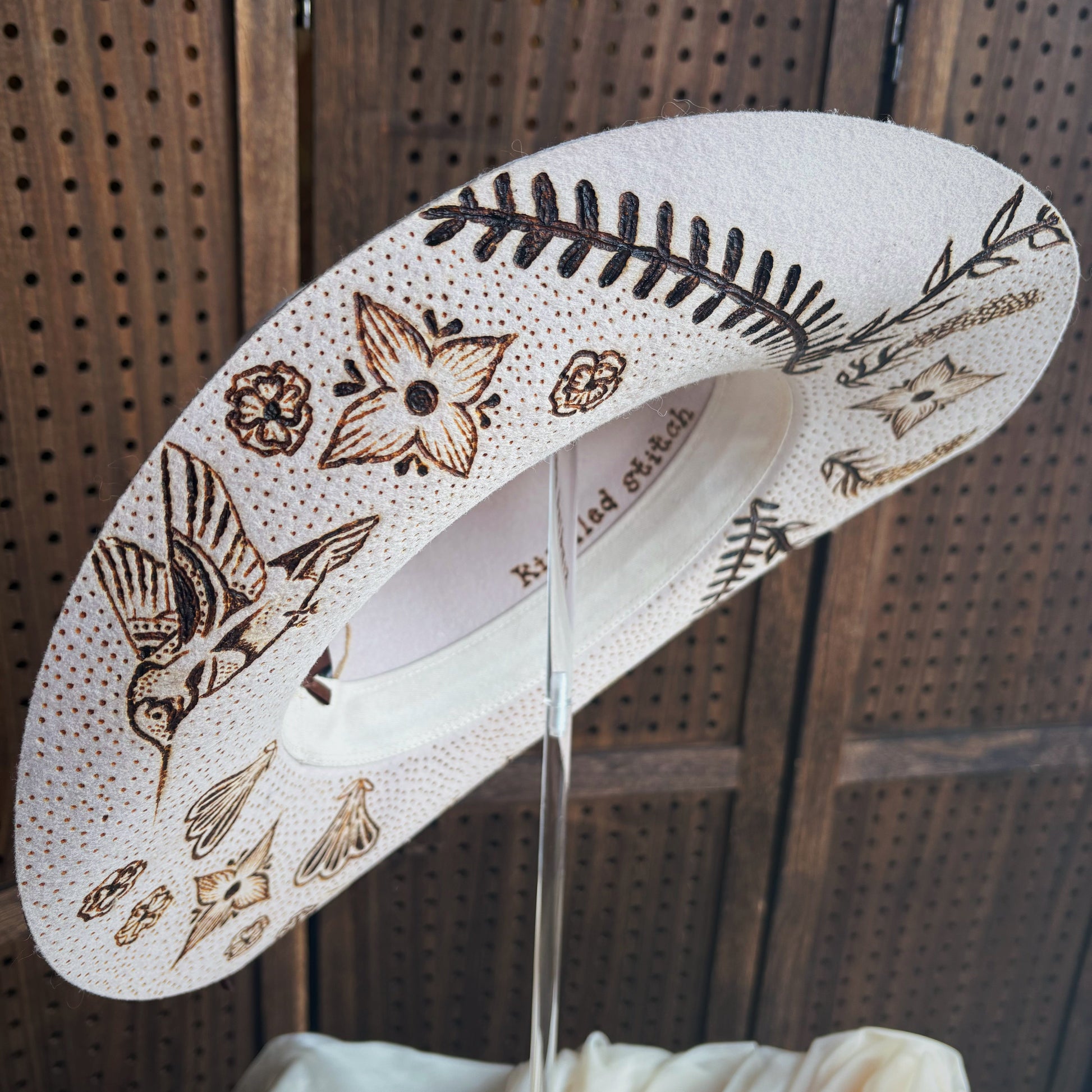 One size fits all • Classic Cowboy 100% Australian Wool • Humming Along from the Foreflame Collection » This hat features a free-hand, finely burned, embroidery-inspired design of hummingbirds and florals tucked beneath the brim. Subtle from above and expressive underneath, the artwork mirrors traditional ornamentation while staying quietly modern. Humming Along is a nod to steady movement, patient craft, and finding rhythm in the everyday experience. This hat was showcased in Fashion Week Spokane's 2025 Fall Runway alongside Rebel Hart Co. fall collection.