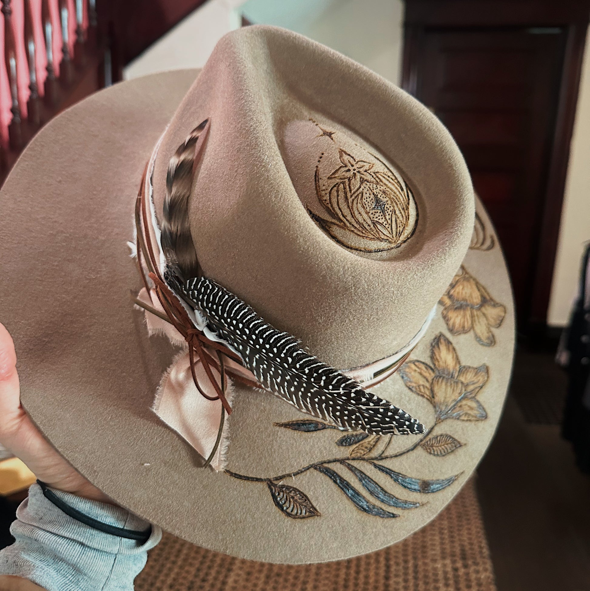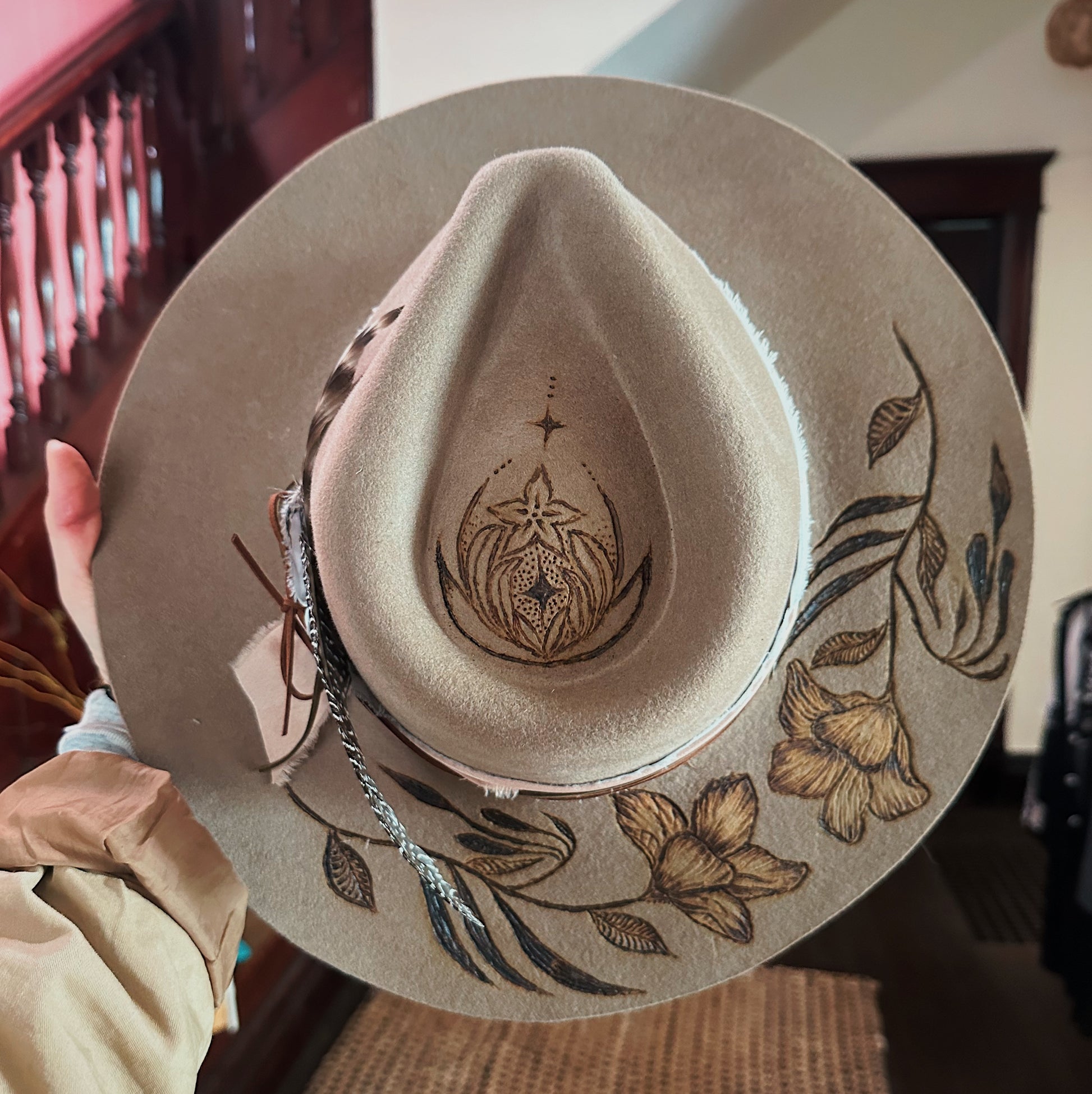 One size fits all • Classic Cowboy Flat Brim 100% Australian Wool • Scorched Stem from the Foreflame Collection » Made for the one who blooms even after the burn. A wilting yet flowering stem design flows across the brim, hand-burned to reveal depth, movement, and quiet intensity.